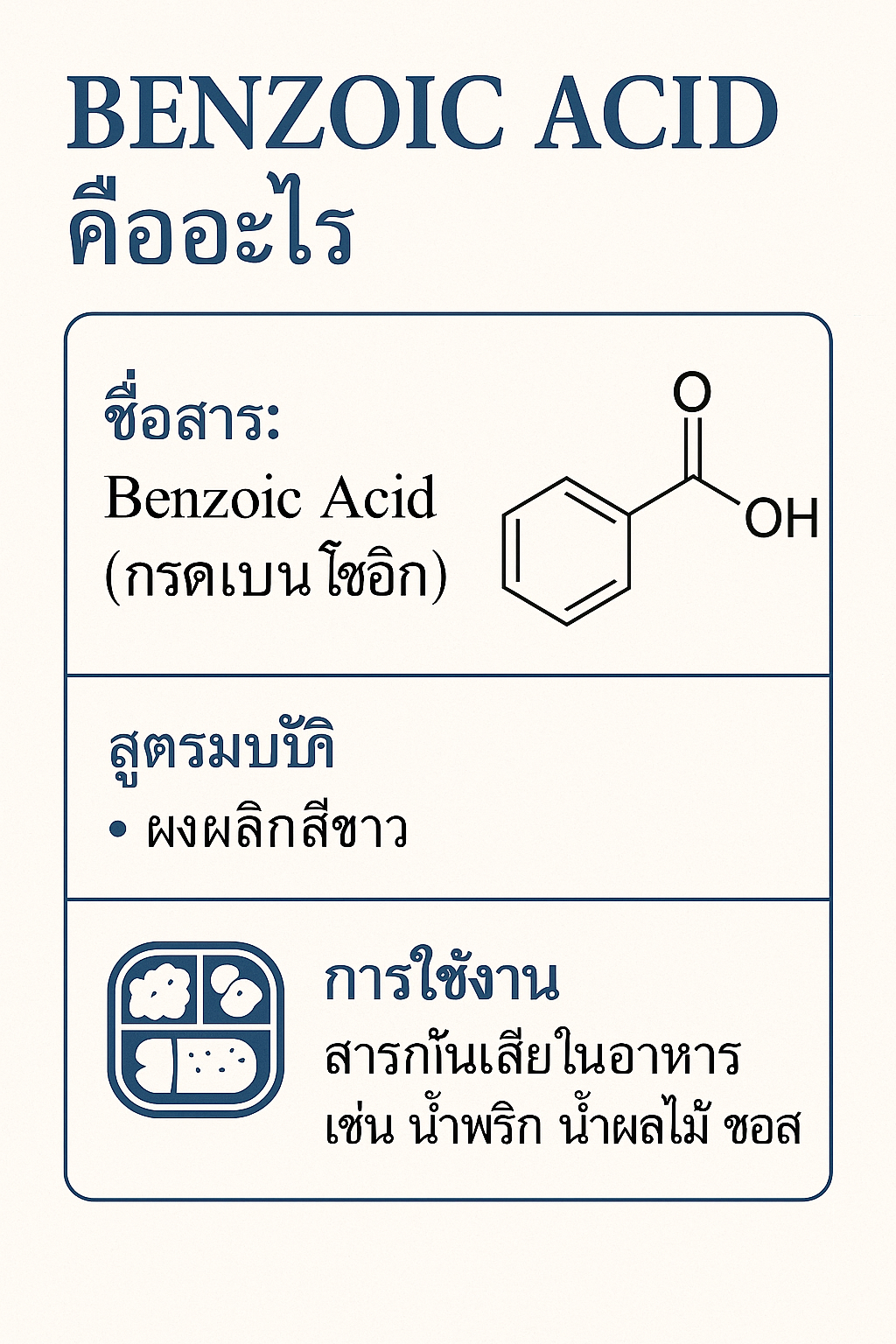 Benzoic Acid (กรดเบนโซอิก) เป็นสารเคมีที่มีลักษณะเป็นผลึกสีขาว ไม่มีกลิ่น หรือมีกลิ่นอ่อนๆ คล้ายกลิ่นยาง